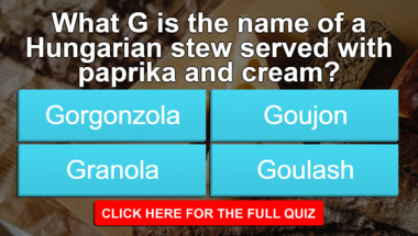 6/10 is what people on average are scoring in this trivia quiz so far. Are you ready to answer questions like "What verb means pouring liquid through a sieve to remove impurities?" and "What G is the name of a Hungarian stew served with paprika and cream?"