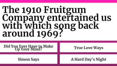 4/10 is the score to beat in this 1960s Songs quiz to put yourself over the average quiz taker. But you're probably going to be able to answer questions "The Monkees entertained us with which song back around 1967?" and "The 1910 Fruitgum Company entertained us with which song back around 1969?" easy!