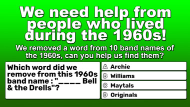In this fun 1960s bands with a missing word quiz we're going to ask questions like "Which word did we remove from this 1960s band name : "The ____ Beans"?" and "Which word did we remove from this 1960s band name : "Freddie & the ____"?".
