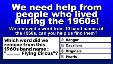 Look forward to questions like "Which word did we remove from this 1960s band name : "Bill Haley & His ____"?" and "Which word did we remove from this 1960s band name : "The ____ Who"?"
