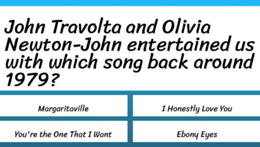 5/10 is the score to beat in this trivia quiz to put yourself over the average quiz taker. But you're probably going to be able to answer questions "Olivia Newton-John entertained us with which song back around 1979?" and "John Travolta and Olivia Newton-John entertained us with which song back around 1979?" easy!